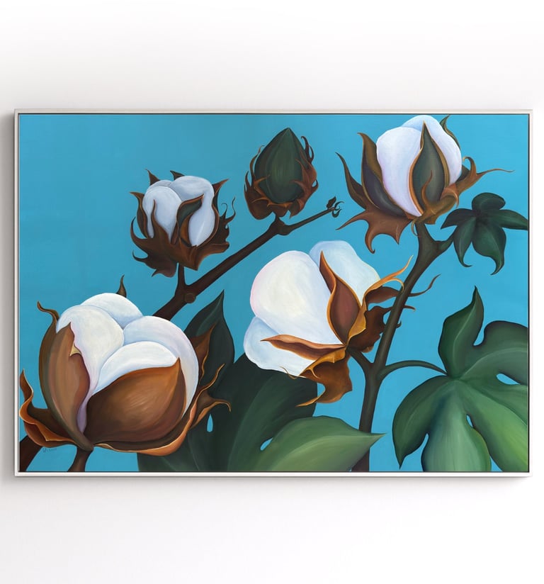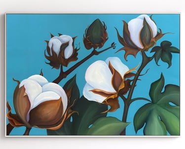 This painting carries that rupture: structured, deliberate cotton forms set against an unyielding sky — the visual echo of a distortion that couldn’t survive its own contradiction.